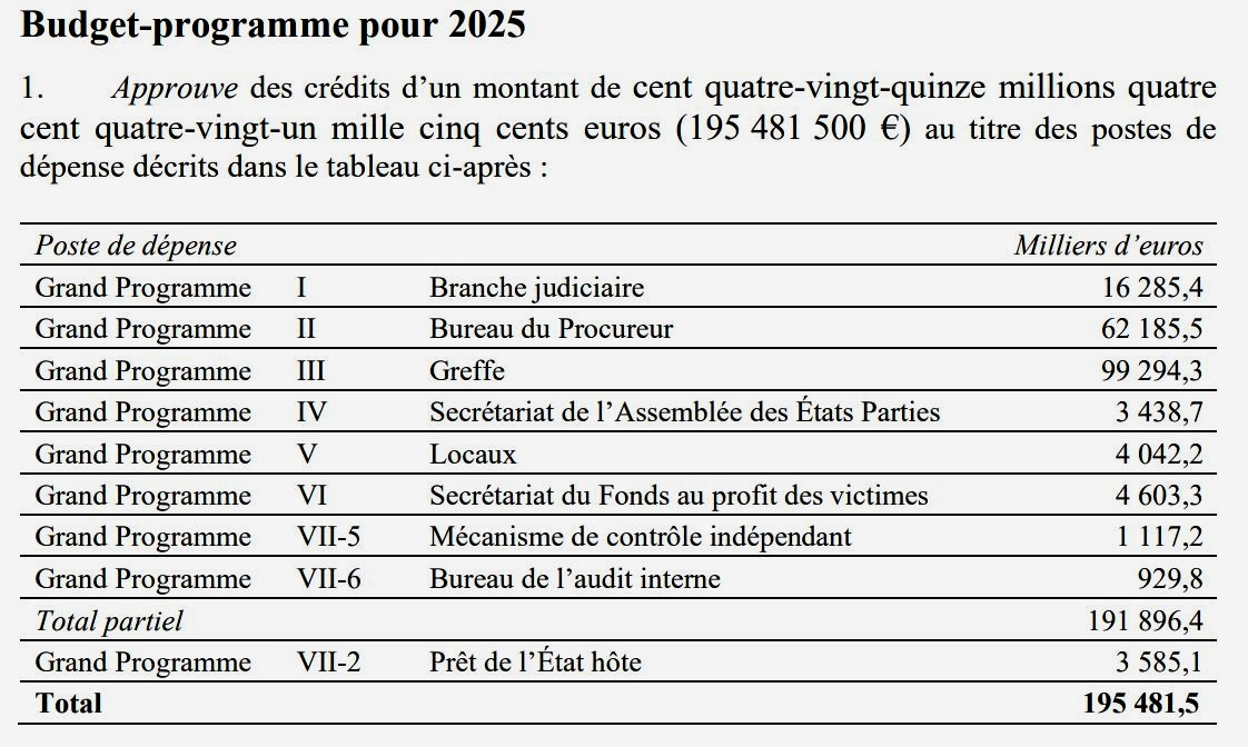 En se basant sur les documents internes de la CPI traitant de sa comptabilité, nous pouvons constater que son budget pour la seule année 2025 est de 195 481 500€ (Résolution ICC-ASP/23/Res.6, Partie I, §A).