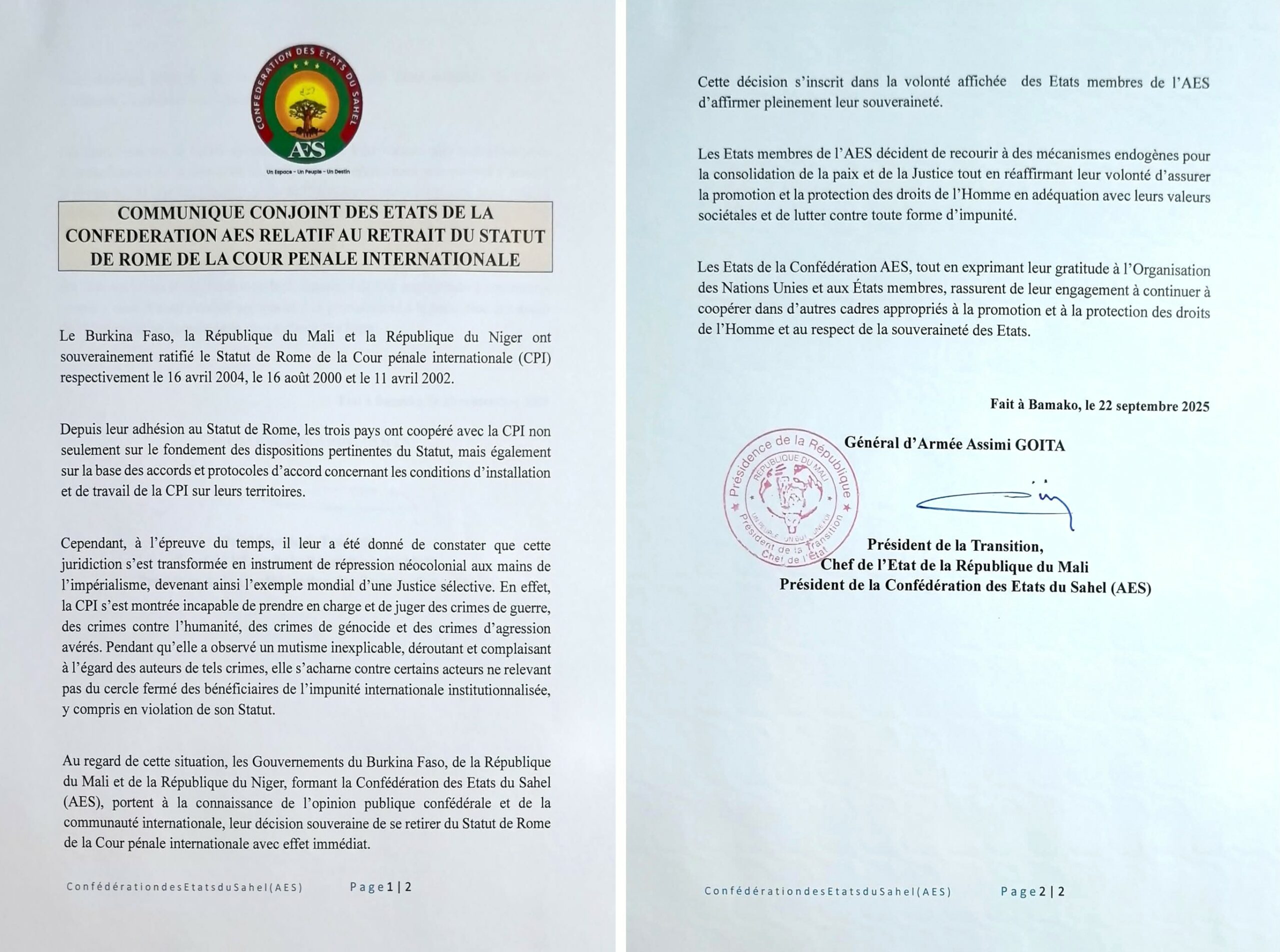 La nouvelle est tombée : après avoir quitté en janvier 2025 la Communauté économique des États de l’Afrique de l’Ouest (Cedeao) – l’architecture supranationale instrumentalisée par les puissances occidentales -, la Confédération dite « Alliance des États du Sahel » (AES), regroupant le Mali, le Burkina Faso et le Niger, annonce ce 22 septembre son retrait de la liste des membres de la Cour Pénale Internationale (CPI).