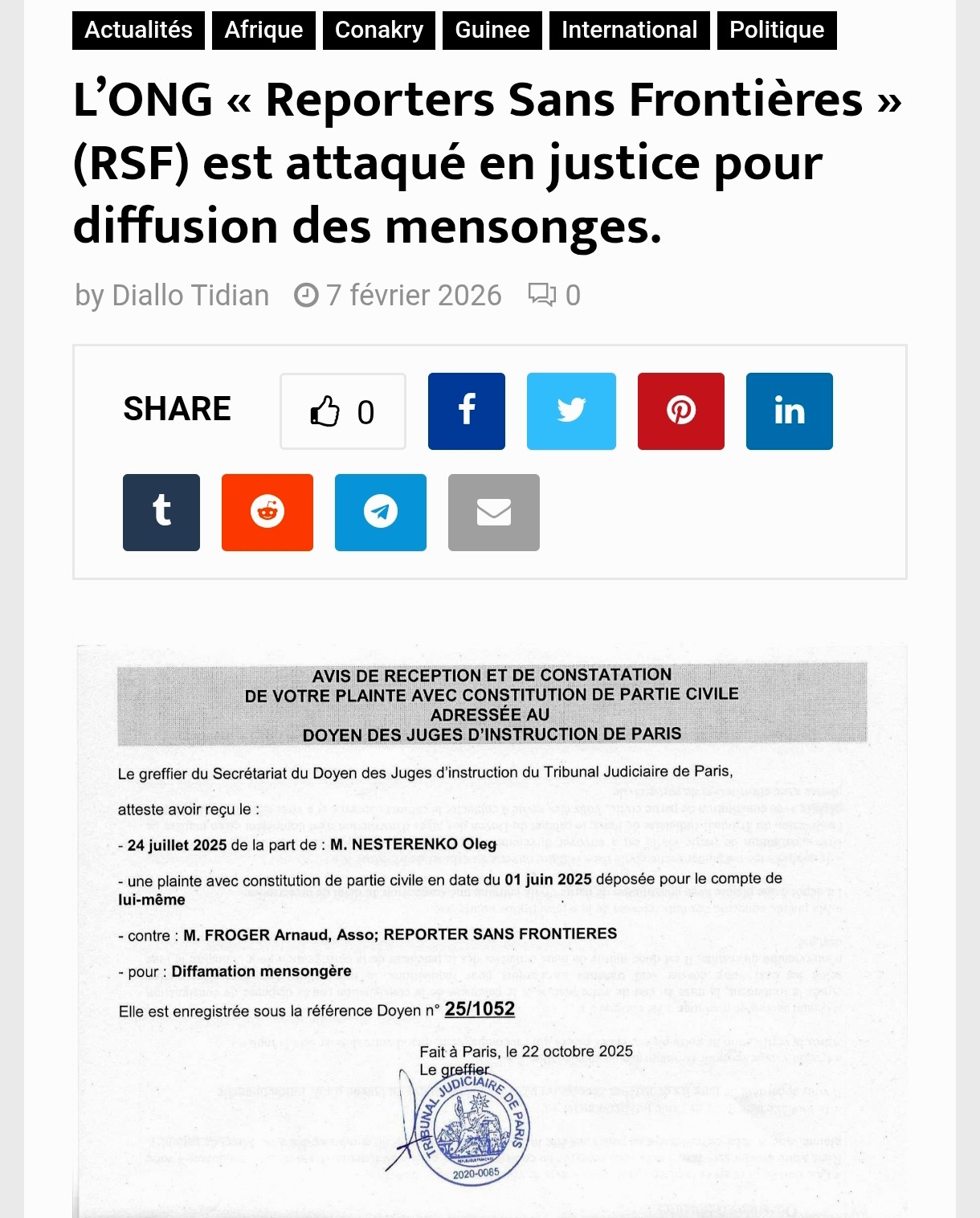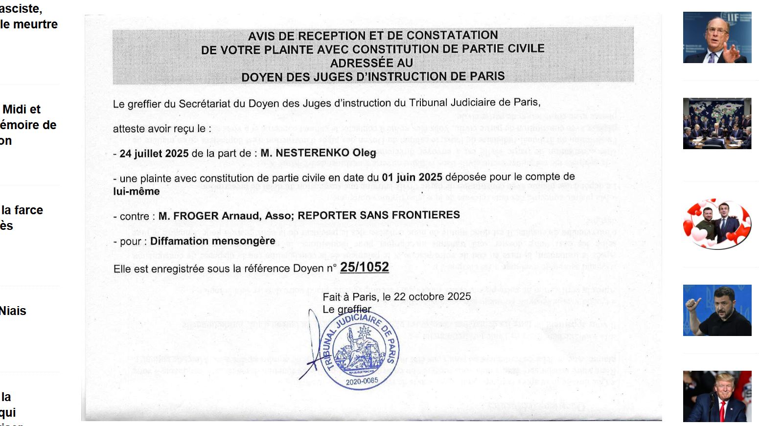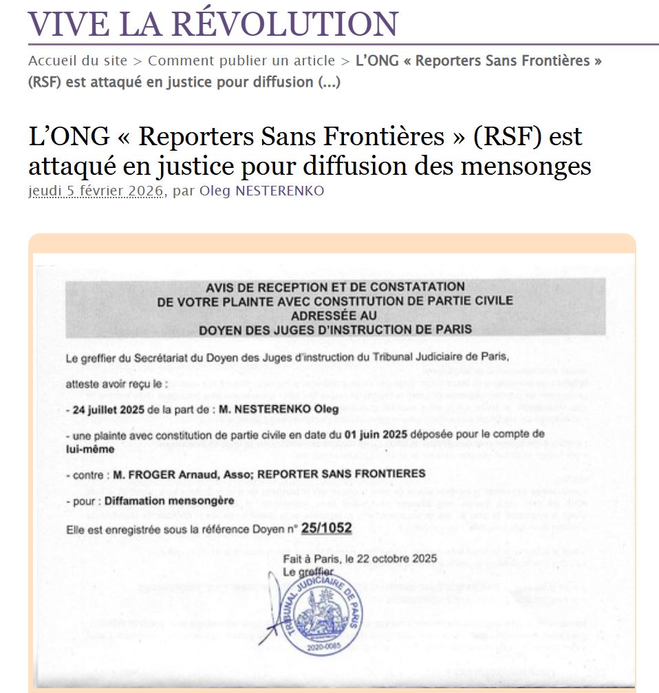 Fort de preuves matérielles et vérifiables, réfutant point par point les allégations fallacieuses proférées par Reporters Sans Frontières, une plainte assortie d’une constitution de partie civile a été déposée auprès du juge d’instruction du Tribunal Judiciaire de Paris.