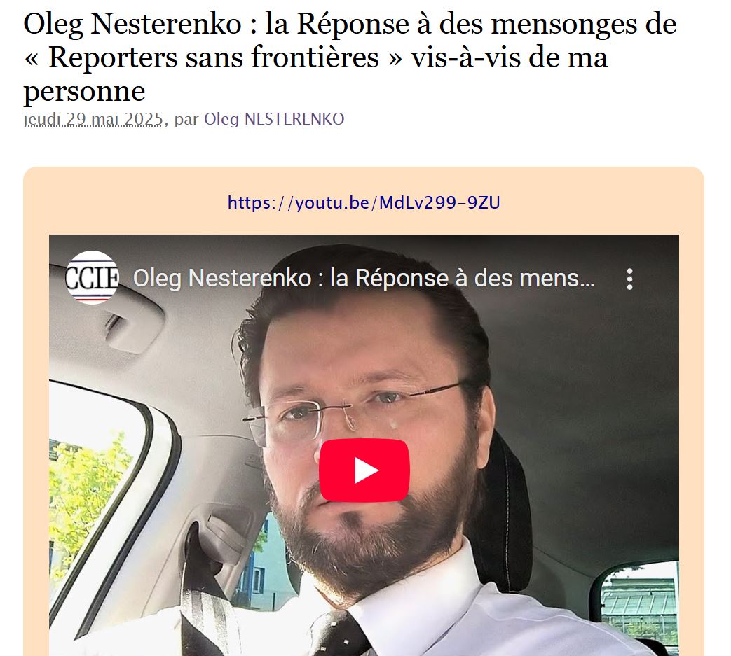« Contacté par RSF, Oleg Nesterenko affirme s’être lancé seul, sans être rémunéré par aucun commanditaire, estimant avoir dû “sortir de sa réserve pour apporter la connaissance de la réalité face à la perversion et à la désinformation qui flambe de manière exponentielle sur le territoire de l’Occident” » – RSF.