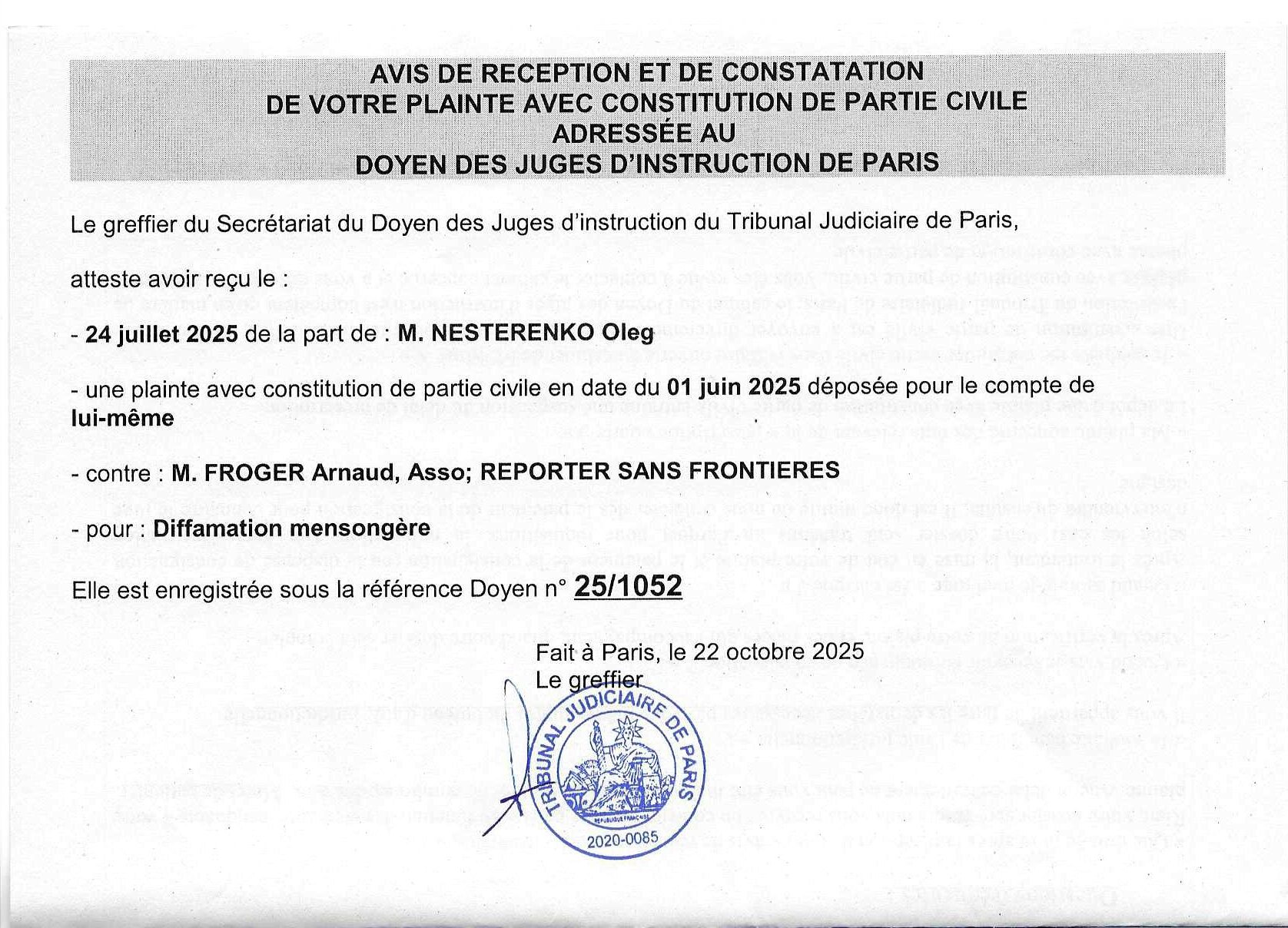 Dépôt de plainte contre RSF et Arnaud Froger /01.06.2025